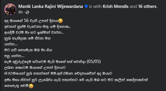 ඒ ගැන සංවේදී සටහනක් ඇය සිය මුහුණුපොතට එකතු කර තිබුණා….