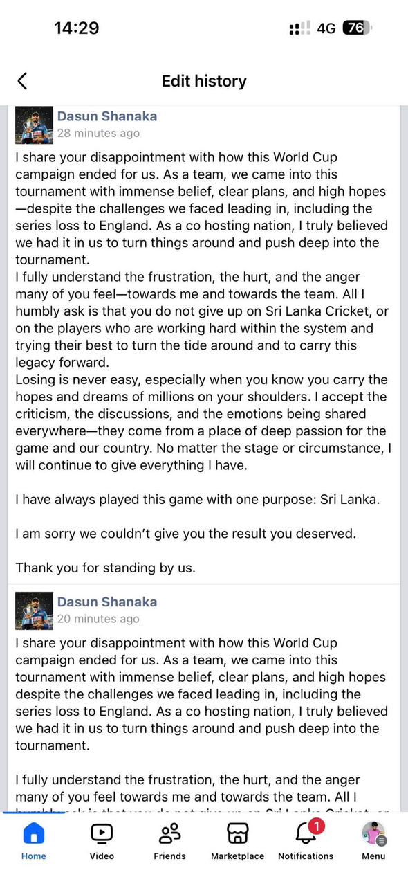 පරාජය කිසි විටෙකත් පහසු නැත විශේෂයෙන් ඔබ මිලියන ගණනකගේ බලාපොරොත්තු සහ සිහින ඔබේ උරහිස් මත තබාගෙන සිටින බව ඔබ දන්නා විට විවේචන,සාකච්ඡා සහ සෑම තැනකම බෙදා ගන්නා හැඟීම් මම පිළිගනිමි ඒවා ක්රීඩාව සහ අපේ රට කෙරෙහි ගැඹුරු ආශාවක් ඇති ස්ථානයකින් පැමිණේ වේදිකාව හෝ තත්වය කුමක් වුවත් මා සතුව ඇති සියල්ල මම දිගටම ලබා දෙන්නෙමි.මම සෑම විටම මෙම ක්රීඩාව ක්රීඩා කර ඇත්තේ එක් අරමුණක් ඇතිවය ශ්රී ලංකාව ඔබට ලැබිය යුතු ප්රතිඵලය අපට ලබා දීමට නොහැකි වීම ගැන මට කණගාටුයි අප වෙනුවෙන් පෙනී සිටීම ගැන ඔබට ස්තූතියි.”