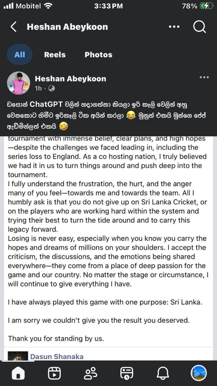 තරග පරාජයෙන් පසු දසුන් ශානක සිය Facebook පිටුවේ තැබූ සටහන 🙂🙌