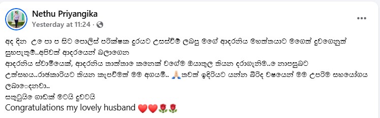 පොලිස් සේවයේ තිරත සිය ආදරණීය සැමියාට ලැබුණු උසස් වීම පිළිබදව සටහනක් තබමින් ඇය මෙලෙස සුබ පැතුම් එක්කර තිබුණා…