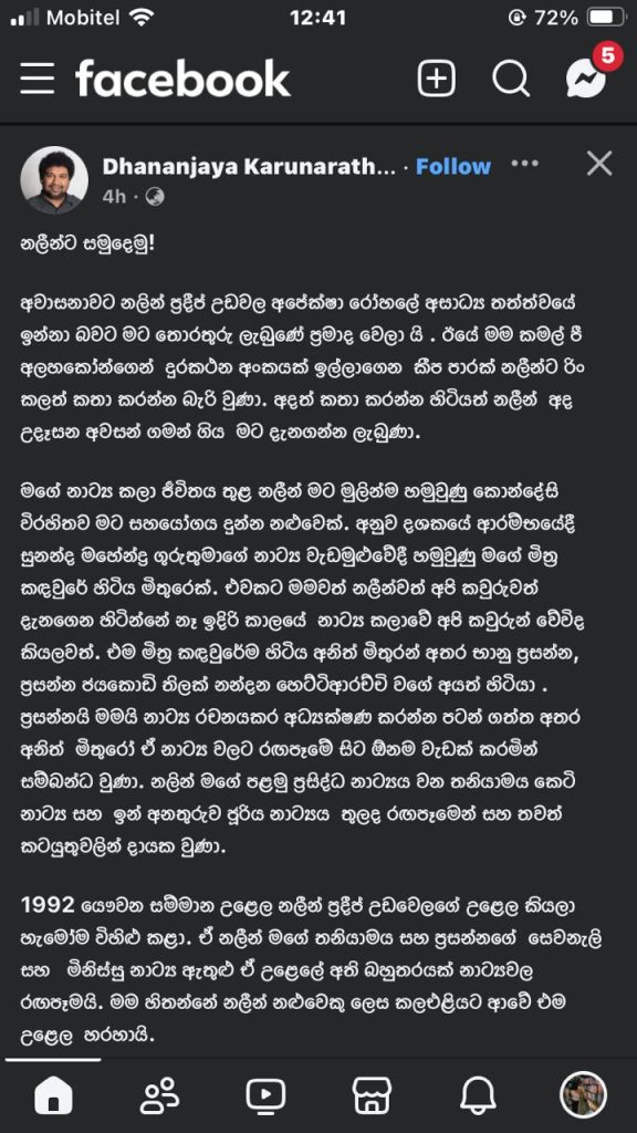 අවාසනාවට නලින් ප්රදීප් උඩවල අපේක්ෂා රෝහලේ අසාධ්ය තත්ත්වයේ ඉන්නා බවට මට තොරතුරු ලැබුණේ ප්රමාද වෙලා යි . ඊයේ මම කමල් පී අලහකෝන්ගෙන් දුරකථන අංකයක් ඉල්ලාගෙන කීප පාරක් නලීන්ට රිං කලත් කතා කරන්න බැරි වුණා. අදත් කතා කරන්න හිටියත් නලීන් අද උදෑසන අවසන් ගමන් ගිය මට දැනගන්න ලැබුණා.