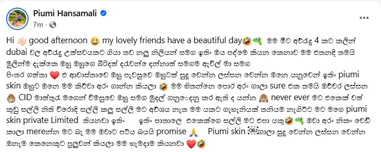 මේ අතර පියුමි හංසමාලි සිය මුහුණු පොතට සටහනක් එක්කර තිබෙනවා.