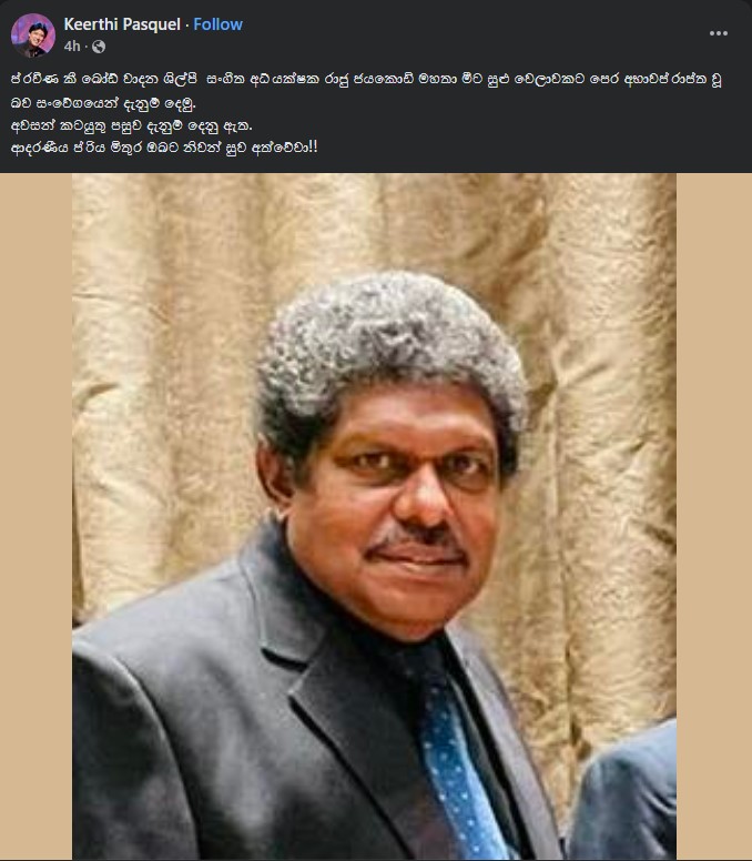 මේ පිළිබදව ප්රවීණ ගායන ශිල්පී කීර්ති පැස්කුවෙල් මහතාද සිය මුහුණු පොතට සටහනක් එක්කර තිබෙනවා