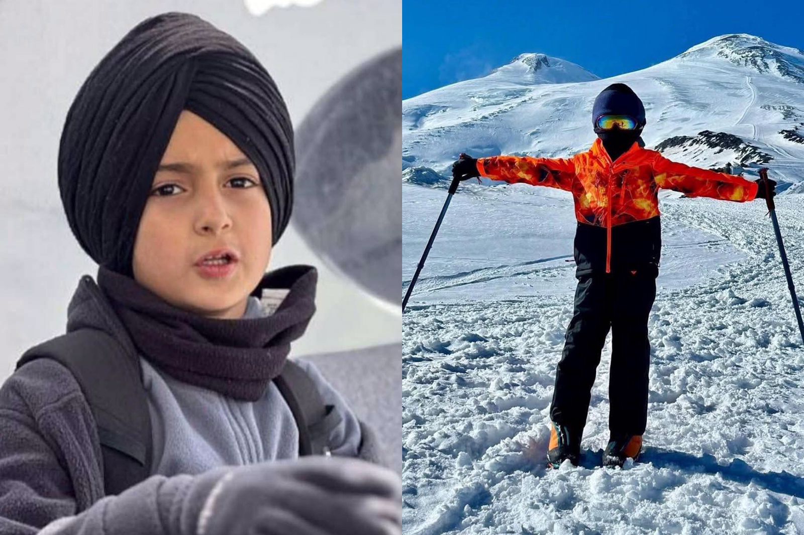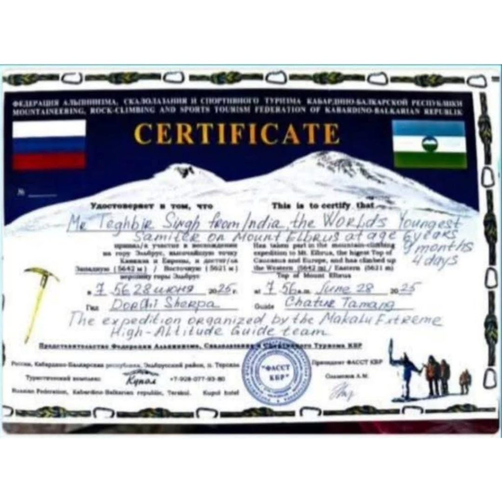 යුරෝපයේ උසම කඳු මුදුන Mount Elbrus තරණය කල ලොව ලාබාලතම පුද්ගලයා වන පන්ජාබ්හි හය හැවිරිදි Teghbir Singh.