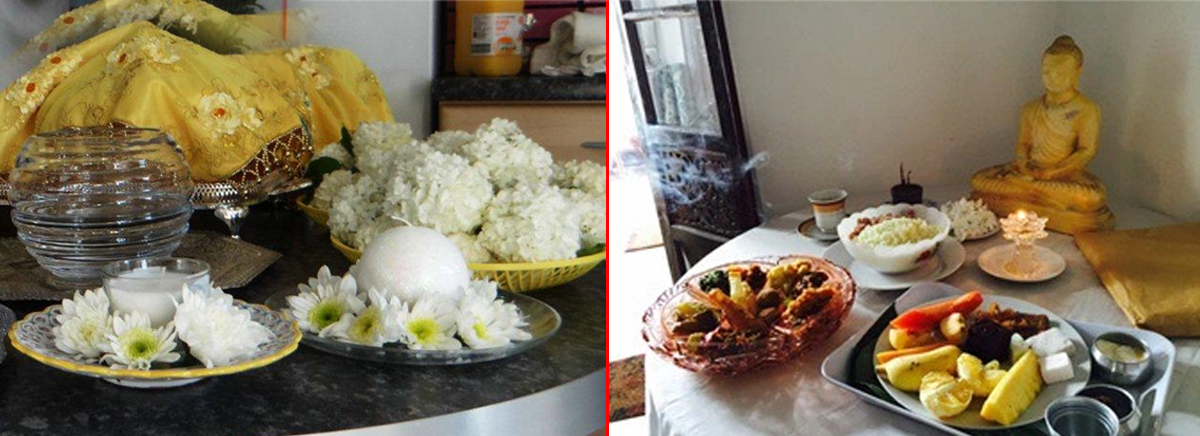 අම්මලා ඔයා ඉස්සෙල්ලාම බුදු කුටිය හොඳට පිරිසිදු කරන්න හැබැයි බුදු රුව අල්ලන්න එපා බුදු රුව පිරිසිදු කරන්න පුළුවන් ඔයාගෙ husbandta. එකට husbandta අලුත් බේසම්, තුවායක් දෙන්න බුදු රුව සේදීමට. ඔයාලට බුදු රුව අල්ලන්න එපා කිව්වේ ඇත්තටම බුදු හිමියන් දැන් ඔයාගෙ බුදු කුටියේ ඉන්නවනම් බුදු රුව ගැහැණු අපට අල්ලන්න බැහැනේ. හරි දැන් ඔයා පසඟ පිහිටුවා බුදු හිමියන් හට නමස්කාර කරන්න දැන් මෙහෙම කියන්න මාගේ මහා කාරුණික බුදු පියාණන් වහන්ස අද දින මා කෙරෙහි අනුකම්පාවෙන් උදෑසන දානයට වඩින ලෙස ආරාධනා කරමි.මෙ විදියට 3 වතාවක් කියන්න.දැන් තමයි ඔයා දානය උයන්න ගන්න ඕනෙ.ඔයා දවල් දානය පූජා කරනවානම් උඩින් තියෙන උදෑසන කියන තැනට දහවල් දානයට කියලා කියන්න ගිලන්පස නම් ගිලන්පස කියලා කියන්න.