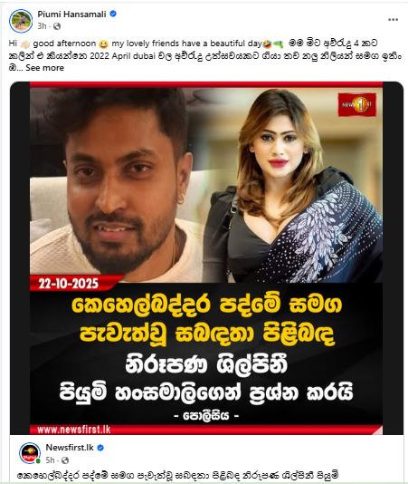 මේ සම්බන්ධයෙන් පියුමි හංසමාලි සිය මුහුණුපොතේ සටහනක් තබමින් මෙසේ සඳහන් කරනවා.
