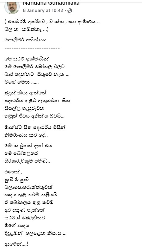 මේ කියන්න යන්නේ අභාවප්‍රාප්ත හිටපු පාර්ලිමේන්තු මන්ත්‍රී නන්දන ගුණතිලක මහතා අවසන් වරට මුහුණු පොතේ තබපු සංවේදී සටහනක් පිළිබදව.