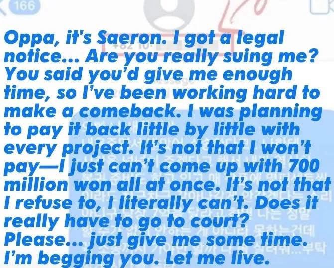 “Oppa, මේ Sae Ron. මට අද ලැබුනා ඔයාගේ ආයතනය මට විරුද්ධව නඩුමඟට යනවා කියන ලිපියක්. ඔයාට මේක මේ තරම් දුරට අරන් යන්න ඕනද? කරුණාකර මාව බේරගන්න…. මම ඔයාගෙන් ඉල්ලා සිටිනවා. මට ටික කාලයක් දෙන්න.”