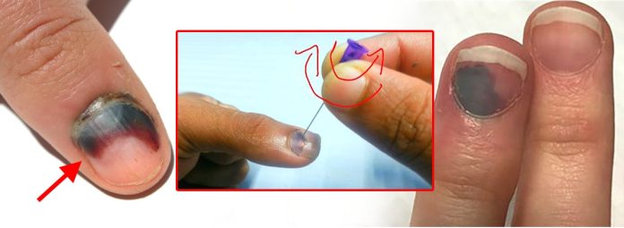 මේක ඉතින් හොදින් අත දෙපාක්වත් හොදින් සබන් ගාල හෝදල පිරිසිදුව කරන්න ඕන වැඩක් …ඔබ මුලින්ම ලගම තියෙන ෂාමසිි එකට දුවල ගිහිල්ල 5cc ඉන්ජෙක්ෂන් සිලින්ඩරයක් අරගෙන එන්න ඒකෙ තියෙනව ඉදිරියෙන් ගලව ගතහැකි needle එක එය කට්ටක් ඒක ගලව ගන්න සිලින්ඩරයයෙන් ඊට පස්සෙ හොද පුලුන් කැල්ලක් හරි ගොස් කැල්ලක් හරි අරන් සර්ජිකල් ස්ප්රිට් ටිකකින් හරි බෙටඩින් ටිකකින් හරි අරන් නියපොත්ත උඩ දෙපාරක් පමන පිහදා ගන්න පසුව අර කට්ට හරියටම නියපොත්ත කලුවි ඇති ස්තානය මත තුඩතබා තද නොකර පහත තුන රෑපයේ දක්වා ඇති පරිදි කට්ටේ උඩින් අල්ලා වමටත් දකුනටත් කරකවන්න එවිට එම තුඩේ ඇති සියුම් බාවය නිසා අර නියපොත්තේ සිදුරක් සැදෙනව බලාගන්න පුලුවන් ඔබට කිසිම වේදනාවක් දැනෙන්නේද නැත මෙහෙම ටිකක් කරනවිට නියපොත්ත යටටම සිදුරු වී යට සම මදක් හිල් වන තෙක් කිරීමේදි ඔබ බලා සිටියදීම අර සිදුරෙන් කුණු ලේ ටික පිටතට ගලාවි ඔබට දැනෙයි එවලේම ක්රමයෙන් වේදනාව පහවෙන හැටි.