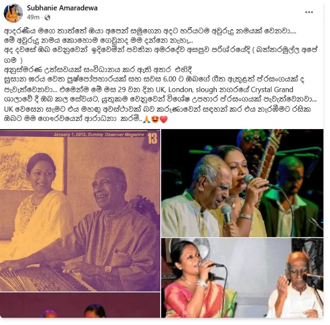මේ පිළිබඳව, අමරදේවයන්ගේ ආදරණීය දියණිය විශාරද සුභානි අමරදේව සිය ෆේස්බුක් ගිණුමෙහි මෙලෙස සටහනක් එක්කර තිබුණා.