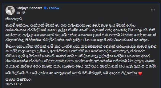 එකී ස්ටෝරියේ සඳහන් වුනු කරුණ හේතුවෙන් සංජය බණ්ඩාර මහතාට මෙන්ම ඔහුගේ පවුලේ සාමාජිකයන්ට සිදුවූ අසීමිත පීඩාව වෙනුවෙන් මාගේ අවංක සහ බලවත් කණගාටුව ප්රකාශ කරන අතර, ඒ වෙනුවෙන් ප්රසිද්ධියේ සමාව අයැද සිටිමි.