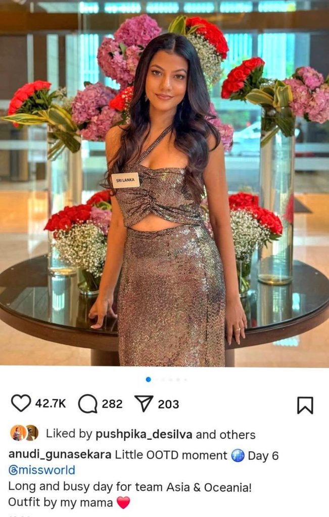 ඇය ඉන්ස්ටග්රැම් අවකාශයට එකතු කරපු මේ රූපයේ යටින් ලියල තියෙනවා, මේ ඇඳුම නිර්මාණය කළේ එයාගේ අම්මා කියලා.