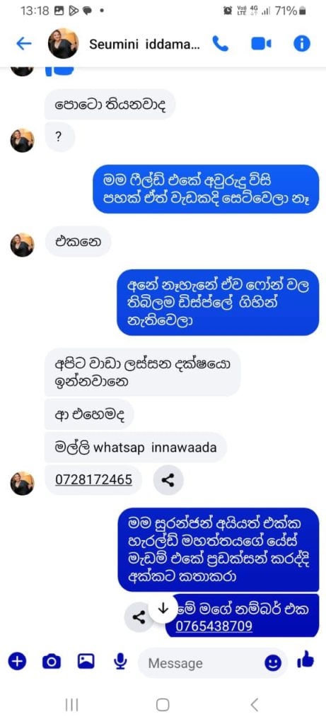 මගේ photos යොදාගෙන Whatsapp account එකකුත් හදාගෙන chat කරල තියෙනවා. මේ ඉහත number එකෙන් chat කරන හෝ කතා කරන කිසිම දේකට මම වගකියන නොලැබෙන අතර ඒ number එක මගේ නොවන බවටත් මෙයින් ප්රකාශ කරමි.