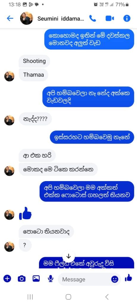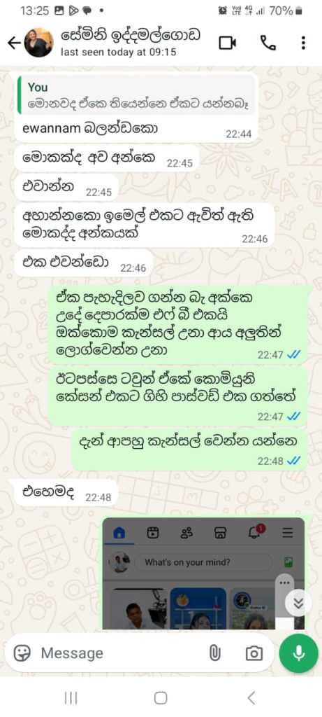 Chat කරල තියෙන screen shots කීපයක් සහ fake fb account එකේ screen shots කීපයක් මම මේ සමඟ upload කරනවා.”