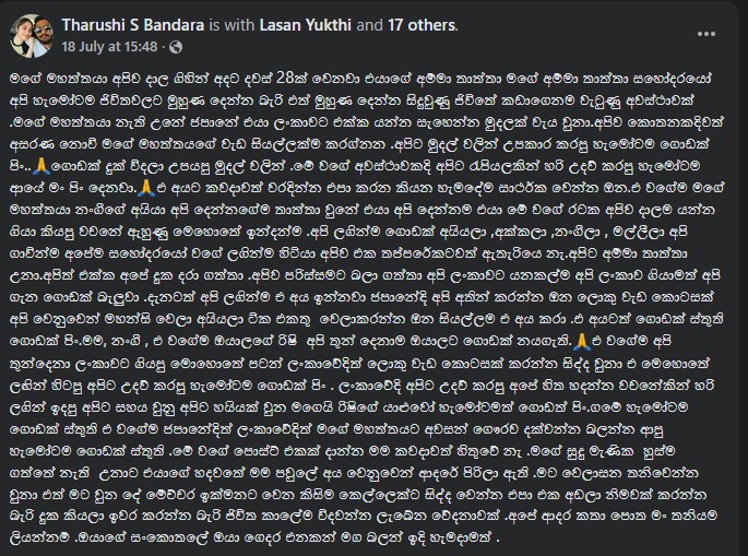 ඒ වියෝවෙන් තවමත් සංවේගයෙන් පසුවෙන ඇය මුහුණු පොතට එක්කළ තවත් සංවේදී සටහනක් තමයි මේ…