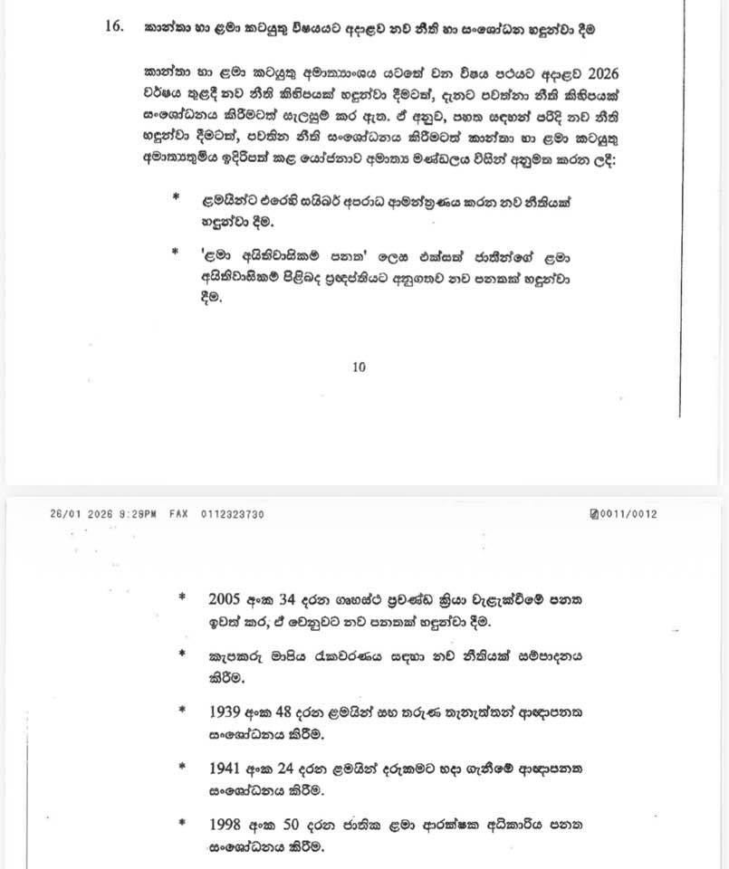 ඊයේ පැවති කැබිනට් මණ්ඩල රැස්වීමේදී කාන්තා හා ළමා කටයුතු විෂයට අදාළව නව නීති මාලාවකට අනුමැතිය ලැබුණා.