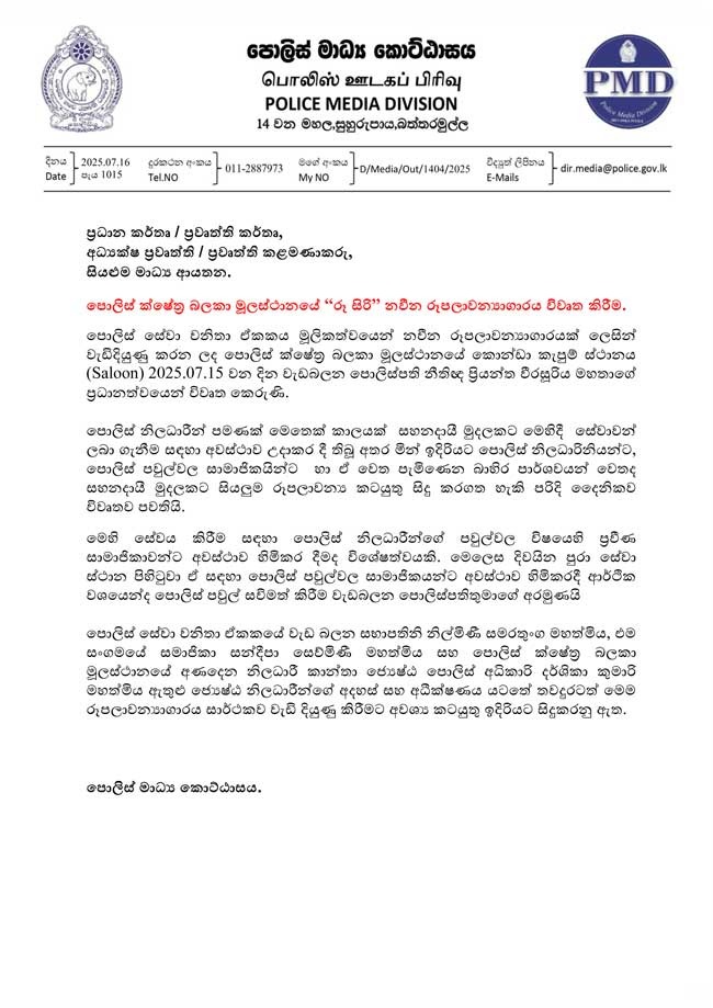 පොලිස් ක්ෂේත්ර බළකා මුලස්ථානයේ ‘රූ සිරි’ නමින් නවීන රූපලාවන්යාගාරයක් විවෘත කර තිබේ.