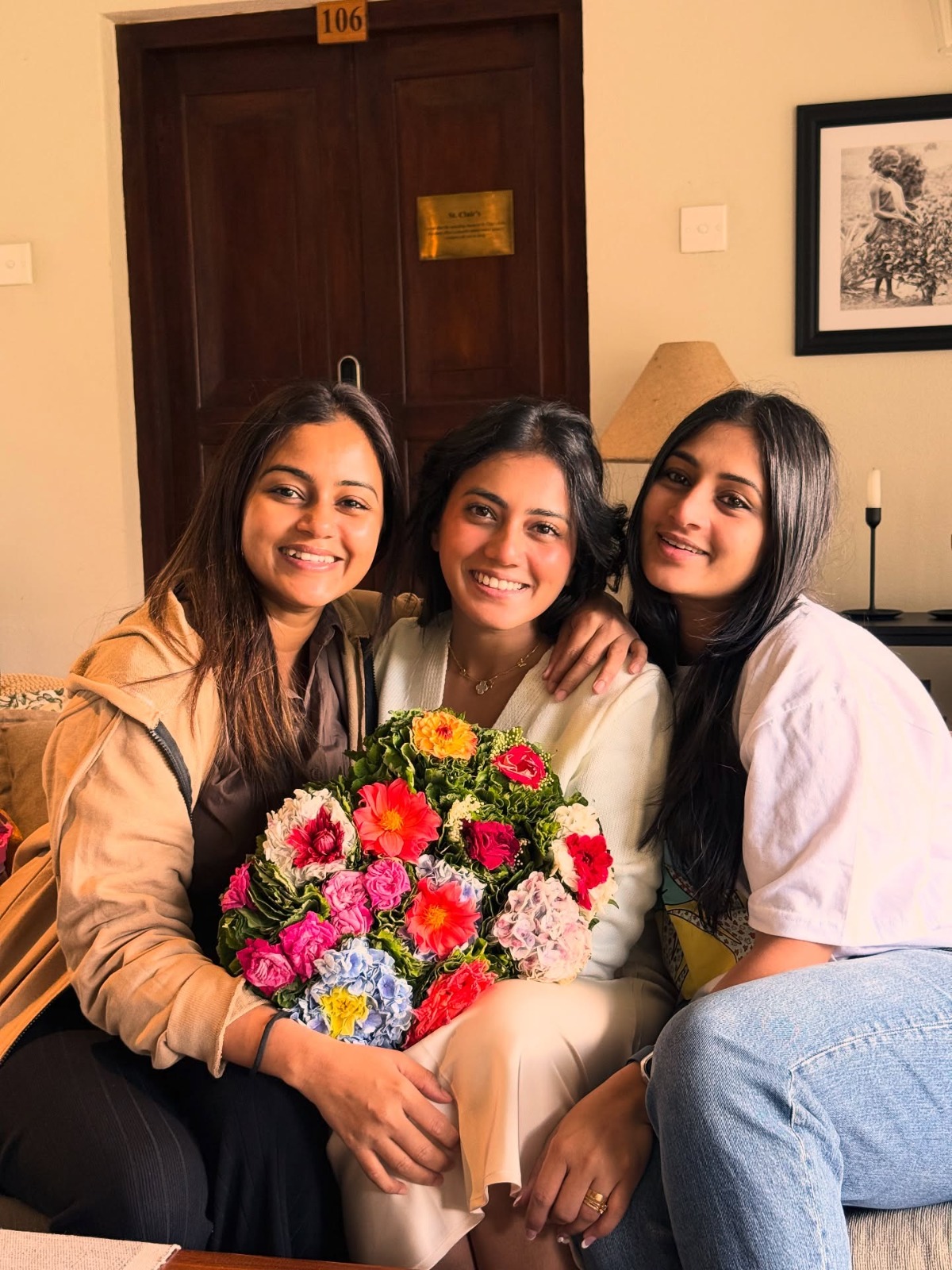 ඉතිං අද උපන්දිනය දවසේ … ලස්සනම ලස්සන මල් පොකුරක් එක්ක ඇයට සුබ පතන්න දිනක්ෂියි , ශෙෂාද්රියි , චූටි සුරංගනාවියෝ දෙන්නයි එකතු වෙලා තිබුණා…