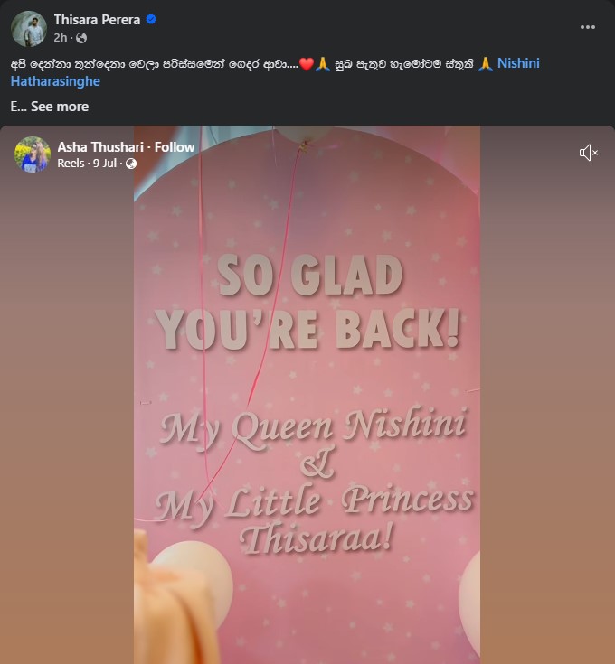 අපි දෙන්නා තුන්දෙනා වෙලා පරිස්සමෙන් ගෙදර ආවා… සුබ පණිවිඩයක් ගැන සමාජ මාධ්‍ය කැළඹූ තිසරගේ සටහන