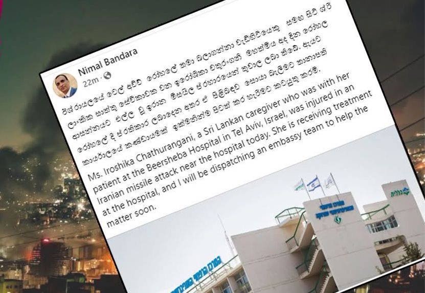 ඊශ්රායලයේ ටෙල්අවිව්හි පිහිටි බීර්ශෙබා (Beersheba) රෝහලේ, රෝහල්ගතව සිටි රෝගියෙකු රැකබලාගත් ශ්රී ලංකාවේ සාත්තු සේවිකාවකට ඉරානය විසින් එල්ල කරන ලද මිසයිල ප්රහාරයකින් තුවාල සිදුව තිබෙනවා.