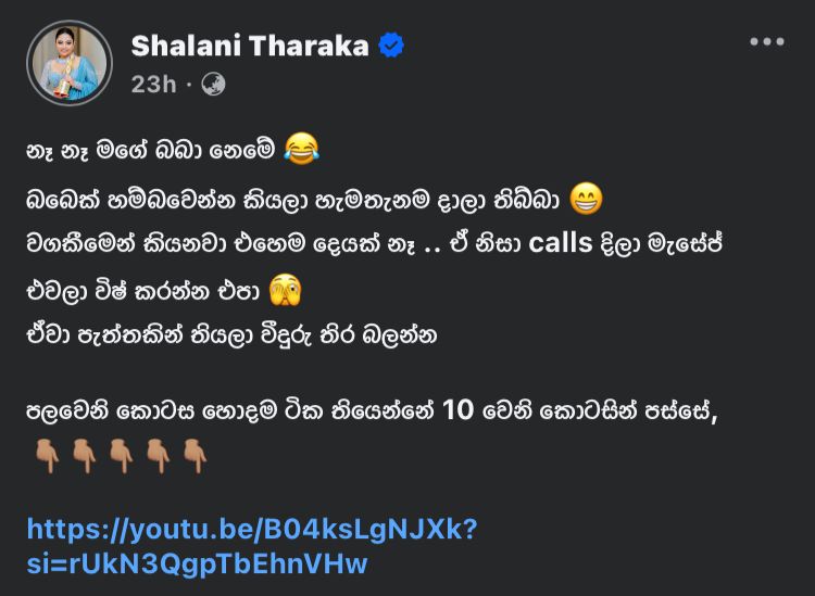 පහුගිය දවස්වල සමාජ මාධ්යයේ හුවමාරු වෙන්න ගත්ත කතාවකට තමයි ශලා මේ විදියට උත්තර දීලා තියෙන්නෙ.