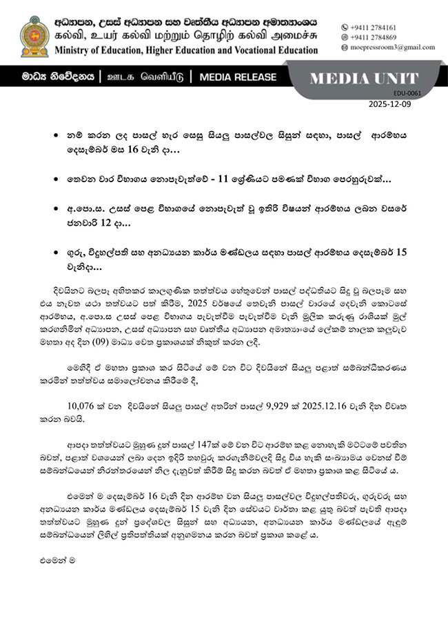 මේ අතර 2025 අ.පො.ස. සාමාන්ය පෙළ විභාග 2026 පෙබරවාරි 14 සිට මාර්තු 02 දක්වා පැවැත්වීමට නියමිත බවයි අධ්යාපන අමාත්යාංශය නිවේදනය කරන්නේ.