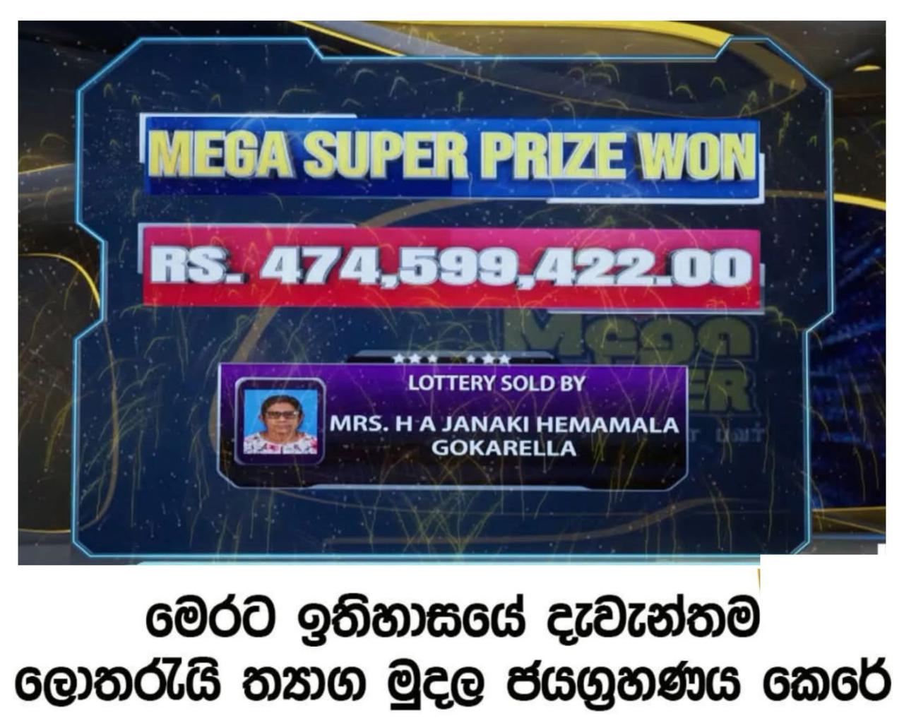 මෙගා පවර් 2210 වන දිනුම් වාරයේ සුපිරි ත්යාගය වන හතලිස් හත්කෝටි හතලිස් පන් ලක්ෂ අනූ නව දහස් හාරසිය විසි දෙකක ත්යාග මුදල සහිත ජයග්රාහී ලොතරැයිපත අලෙවි කර ඇත්තේ ගොකරැල්ල ප්රදේශයේ එච්.ඒ.ජානකී හේමමාලා අලෙවි නියෝජිතවරියයි.