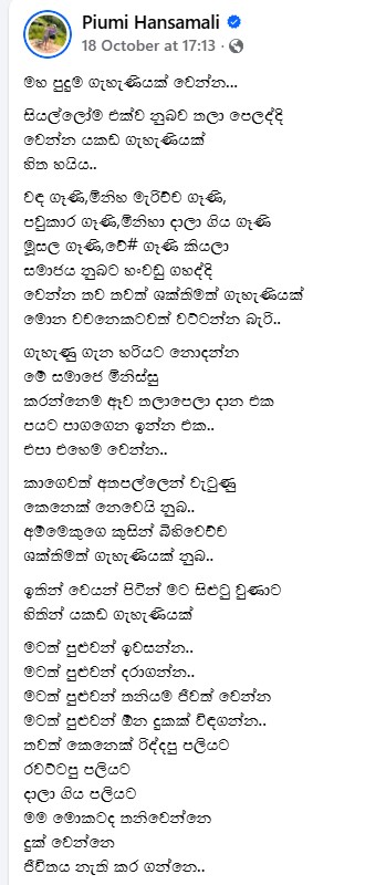 සමාජ මාධ්යයේ අතිශය ජනප්රිය චරිතයක් වුණු පියුමි සිය මුහුණු පොතට සටහනක් එක්කර තිබුණා.