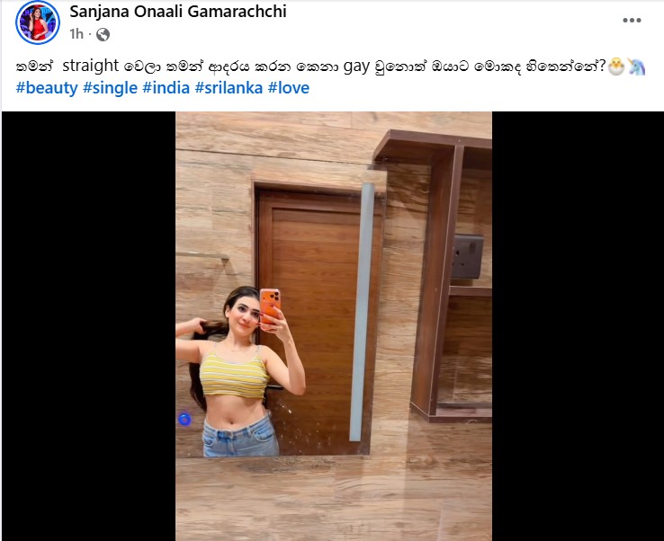 තරු ගොසිප් “තමන් straight වෙලා තමන් ආදරය කරන කෙනා gay වුනොත් ඔයාට මොකද හිතෙන්නේ?” – ජනප්රිය නිළි සංජනා මුහුණු පොතට එක්කළ සටහන.. – Photos December 31, 2025 0 1193 සංජානා ඔනාලි, ලංකාවම ආදරය කරන දක්ෂ , ඒ වගේම ජනප්රිය කලා තරුවක්. මුහුණුපොතේ පළවුණු සටහනක් නිසා පහුගිය දවස්වල ඇය ගැන දැඩි කතාබහක් ඇති වුණා. ඒ අතරේ ඇය අද, මෙන්න මේ විදිහේ සටහනක් ඇය මුහුණුපොතට එක්කරලා තිබුණා.
