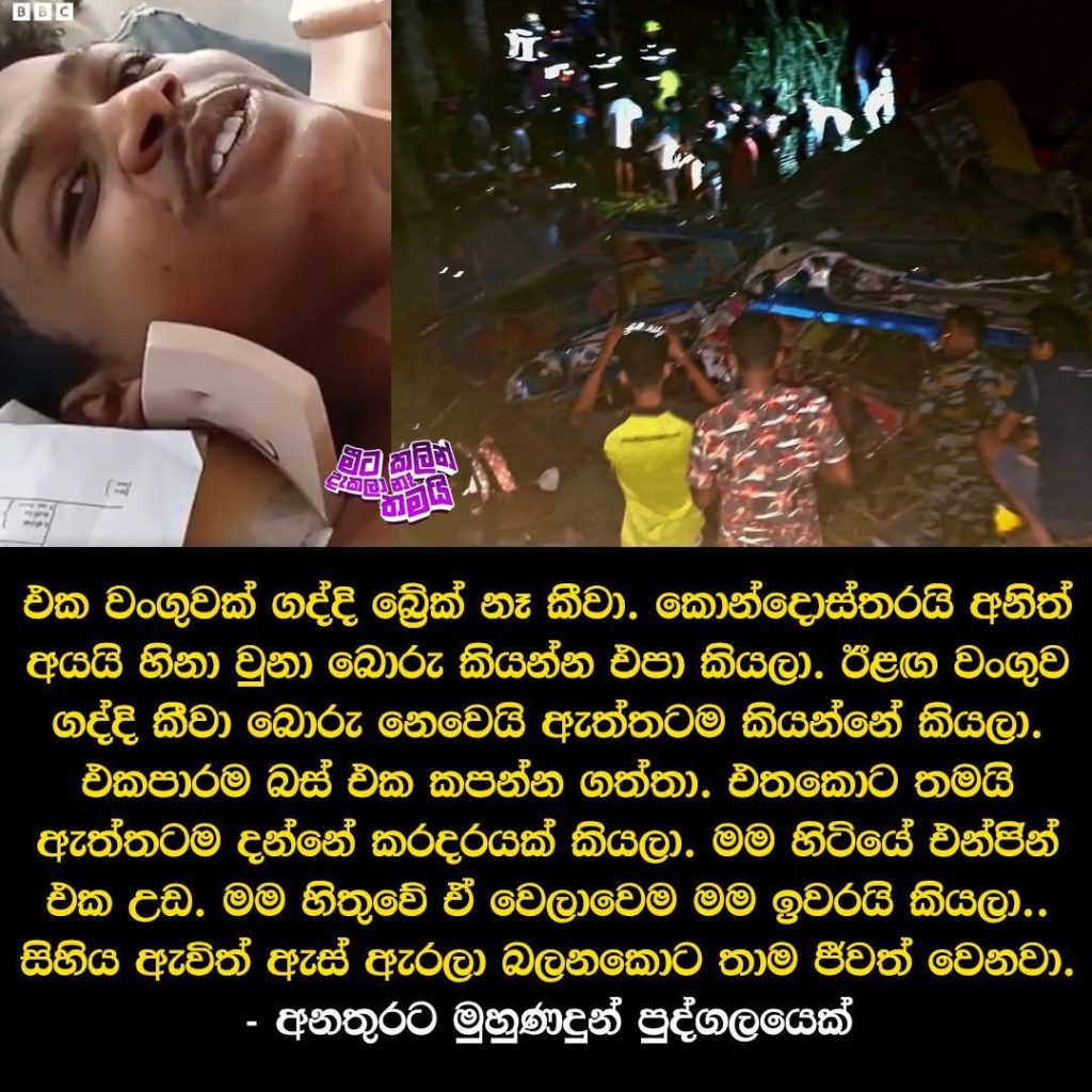 එක වංගුවක් ගද්දි බ්රේක් නෑ කීවා. කොන්දොස්තරයි අනිත් අයයි හිනා වුනා බොරු කියන්න එපා කියලා. ඊළඟ වංගුව ගද්දි කීවා බොරු නෙවෙයි ඇත්තටම කියන්නේ කියලා.